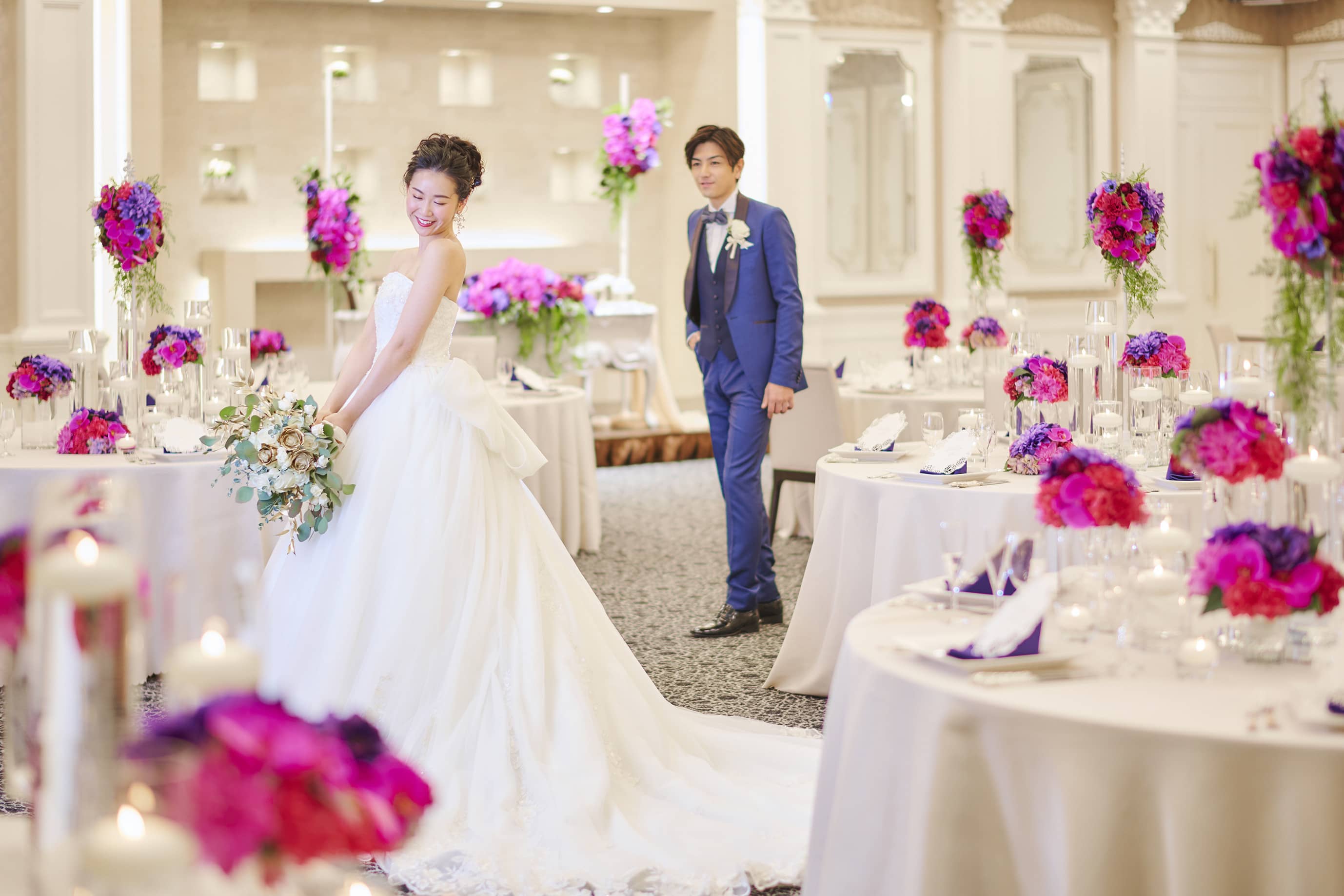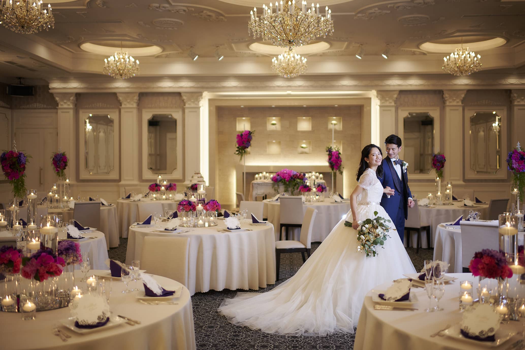 8つのバンケットの中で、最も開放感のある会場「Hisho」はヨーロピアンエレガンス薫るラグジュアリーな空間。天井高は5.5mにおよび、鏡には美しいシャンデリアの光が反射して、ステージをより一層華やかに演出します。さらに、表情の異なるラインストーンがメインテーブルの後ろに浮かび上がり、おふたりの主役気分を盛り上げてくれます。会場前のホワイエは真っ白な空間に自然光が差し込み、記念撮影におすすめなので、ゲストと思い出の一枚をたくさん残してみて。